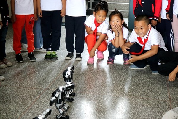 9时,南宅小学的学生在教学楼一楼大厅集合,在老师和实践队队员的带领下分批有序参与了科创宣讲平台活动。在向同学们展示一些机械作品的运动形式后,陈浩利用现场的科创机械作品结合所学机械知识,向当地学生介绍了各类科创机械作品的工作形式和其原理。当地学生对本次宣讲表现出浓厚的兴趣,细心观看各个作品并积极提问。在观看机器人表演环节,同学们被机器人的舞蹈所吸引,还有部分同学模仿机器人的动作。