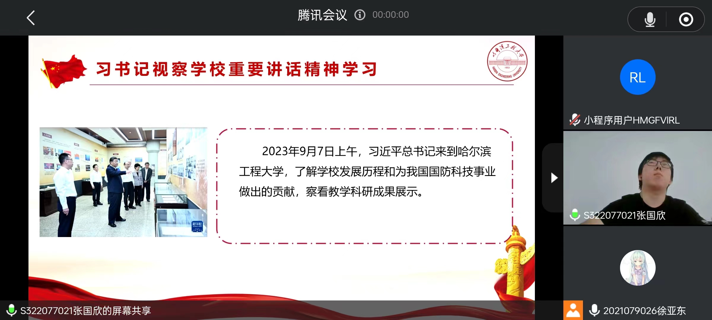 本科生第一党支部徐亚东结合学业生涯规划,宣讲习近平总书记视察bw必威西汉姆联官方网站重要讲话精神。首先,他给出了学生生涯规划的建议。之后,他号召学弟学妹们珍惜时间,最后,他强调:作为哈军工传人,我们要牢记习总书记嘱托,努力学习,刻苦钻研,不忘初心,砥砺前行,让青春在全面建设社会主义现代化国家的火热实践中绽放绚丽火花!