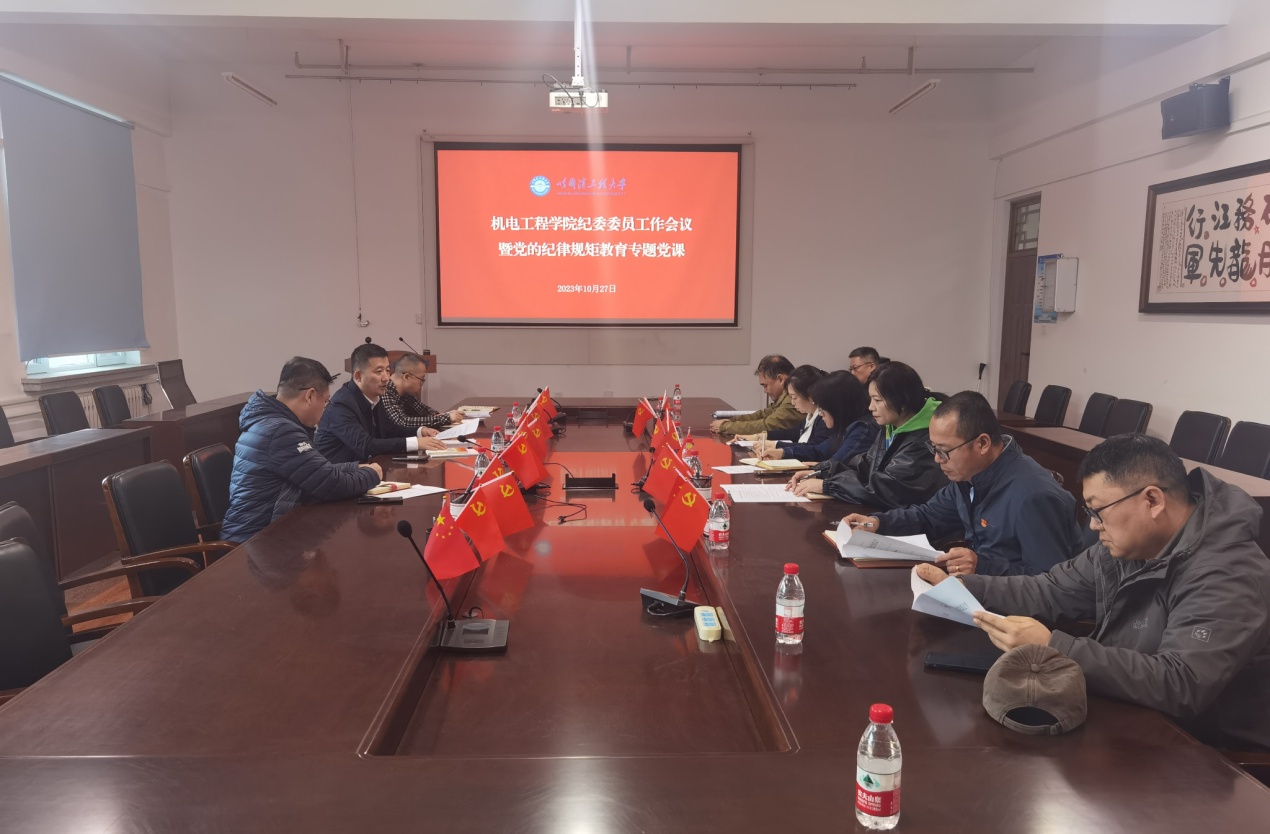 1027日下午,机电学院在61号楼3045会议室召开纪委委员工作会议暨党的纪律规矩教育专题党课,学院各教工党支部纪检委员参加会议。学院党委副书记、纪委委员侯磊出席会议并作专题党课。