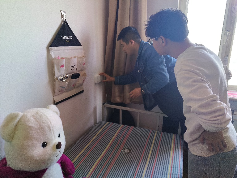 冯启营、刘鸣共同检查了寝室内电器情况,仔细了解了同学们的用电需求,针对寝室内插排位置不固定问题,冯启营利用所携带的钻孔和排线工具,对寝室内插排及电线进行了专业安装和固定。