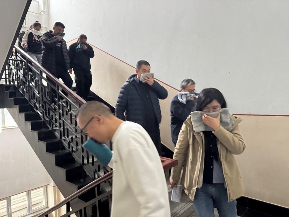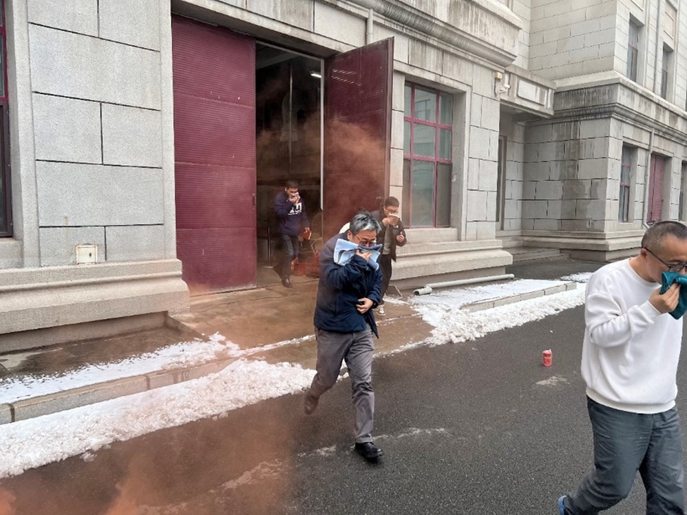 理论培训结束后,紧张有序的疏散演练正式拉开帷幕。为达到演练效果,本次演练分别从两个场地开始,模拟两个场景的疏散。场景一为某学生工作室突然发生火情并失控需紧急疏散,场景二为集体开会会场失火且无法扑灭。两个场景演练同步进行,设置了工作室学生与会场安全员火情报告求助电话演练。演练从火情报告开始,安全值班员接到学生的报警电话后评估火情并对学生下达撤离指令,学生工作室迅速组织学生疏散。会场这边按照现场指挥发出的具体指令,安全员引导逃生人员用湿毛巾捂住口鼻,按照预定的疏散路线迅速、有序地撤离至安全区域。全体师生均快速、安全疏散完毕,演练达到了预期效果。